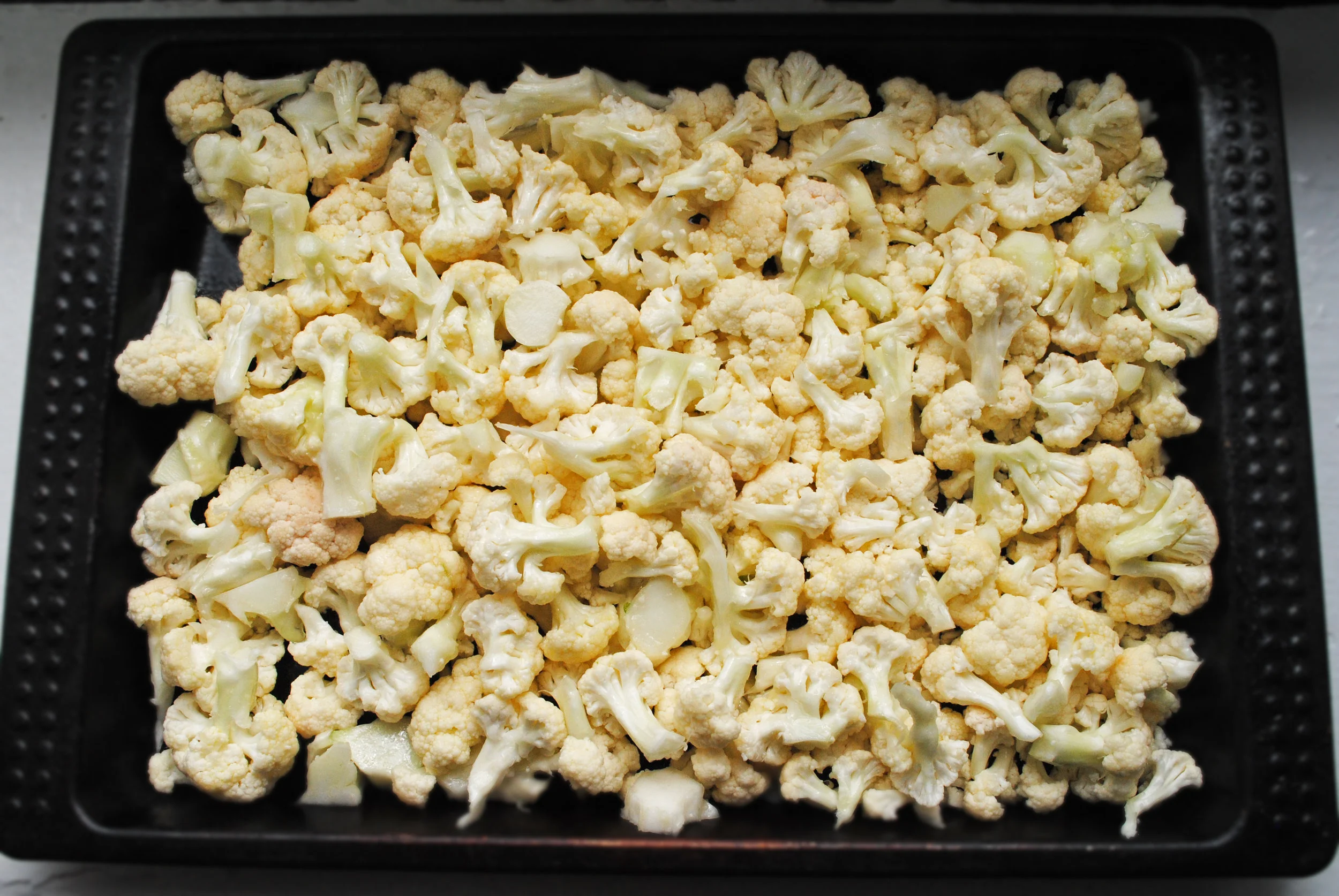Spray your sheet pans with a good amount of cooking spray. You may be tempted to use foil, and I'd understand if you want to preserve the unmarred beauty of your pans. That being said, the cauliflower will caramelize a lot better without the foil, and pans were meant to get dirty. It builds their character.