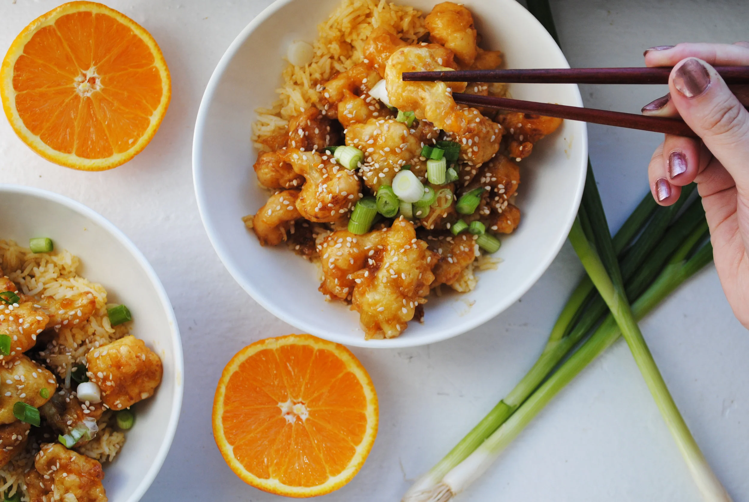 Does that seem like a non-sequiter? Maybe! But here's where I start to make sense. Apparently the orange chicken at Panda Express is super tasty. Like, it might have cocaine in it due to how obsessed people are with it. In my spare time I tend to daydream about ways to use cauliflower as a substitute in chicken recipes, because cauliflower can be cut into cute nugget shapes and can be, here's that word again, "meaty." (did you feel my shuddering through the screen?). I'm super fun at parties. So, whenever I saw orange chicken posts or recipes I thought, oh damn, I can totally sub fried cauliflower in this. That's how this recipe was born.