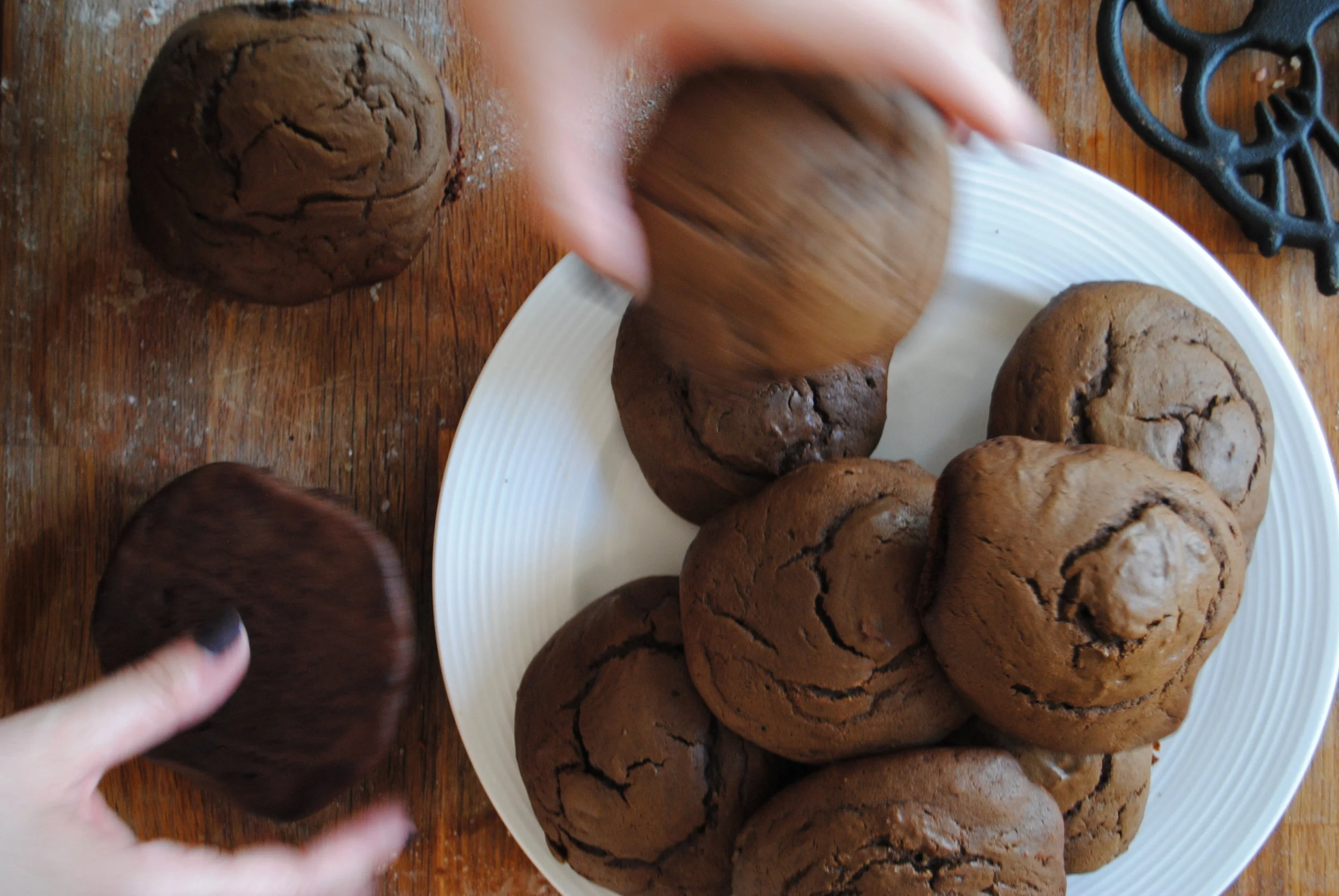 Prepare the pies: once the cake halves are completely cooled, you get to play a fun game called "match the whoopie pies," where you find the whoopie pies that are the same size and will make the most even pies. Thrilling, I know. When everyone has a partner, take one half and slather it with as little or as much buttercream as you'd like. Stick another half on top and press the two halves together gently but firmly so that they stick.