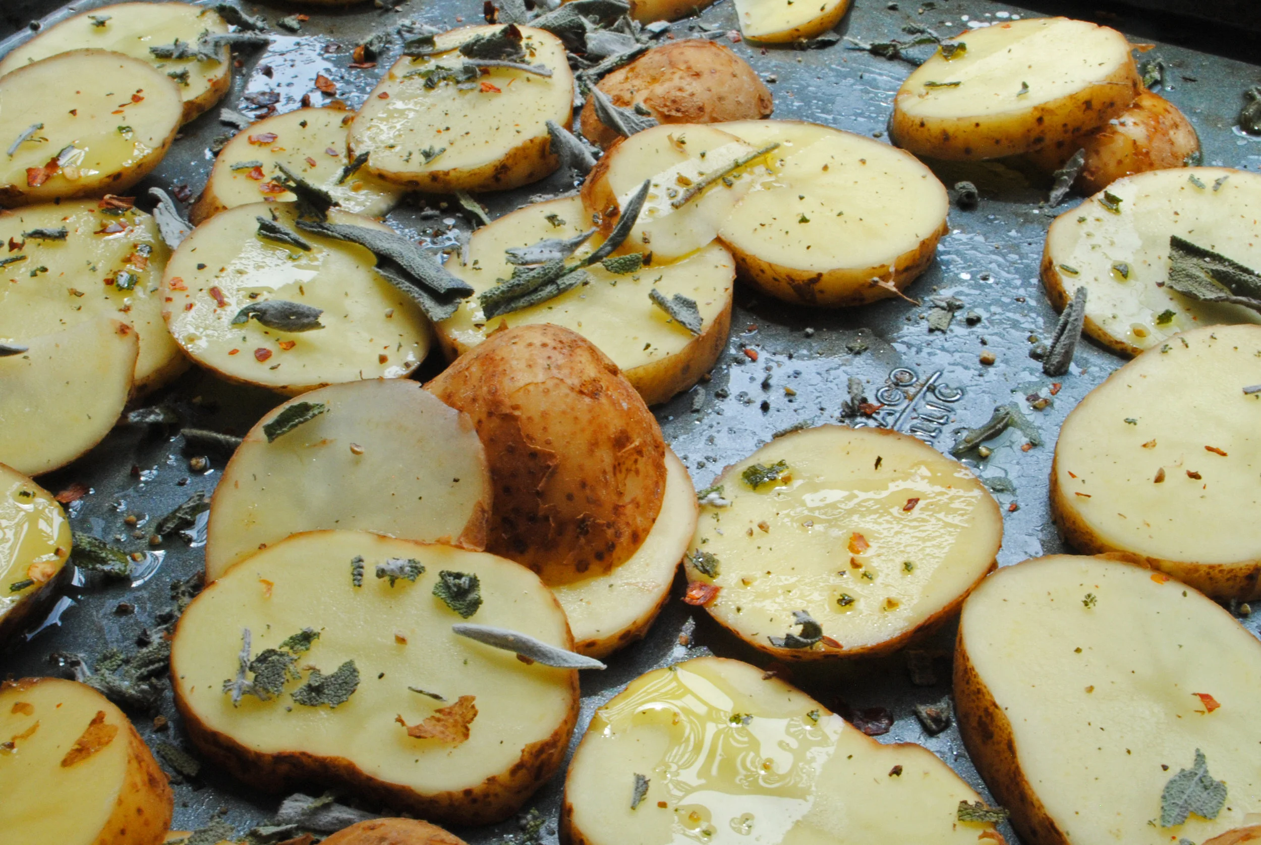 Grease the pan with 1 tbs of olive oil. Then arrange the potatoes on a pan. Sprinkle with sage, salt, pepper and red pepper flakes. Drizzle potatoes with rest of the olive oil. Toss to coat and rearrange, minimizing overlapping as much as possible.