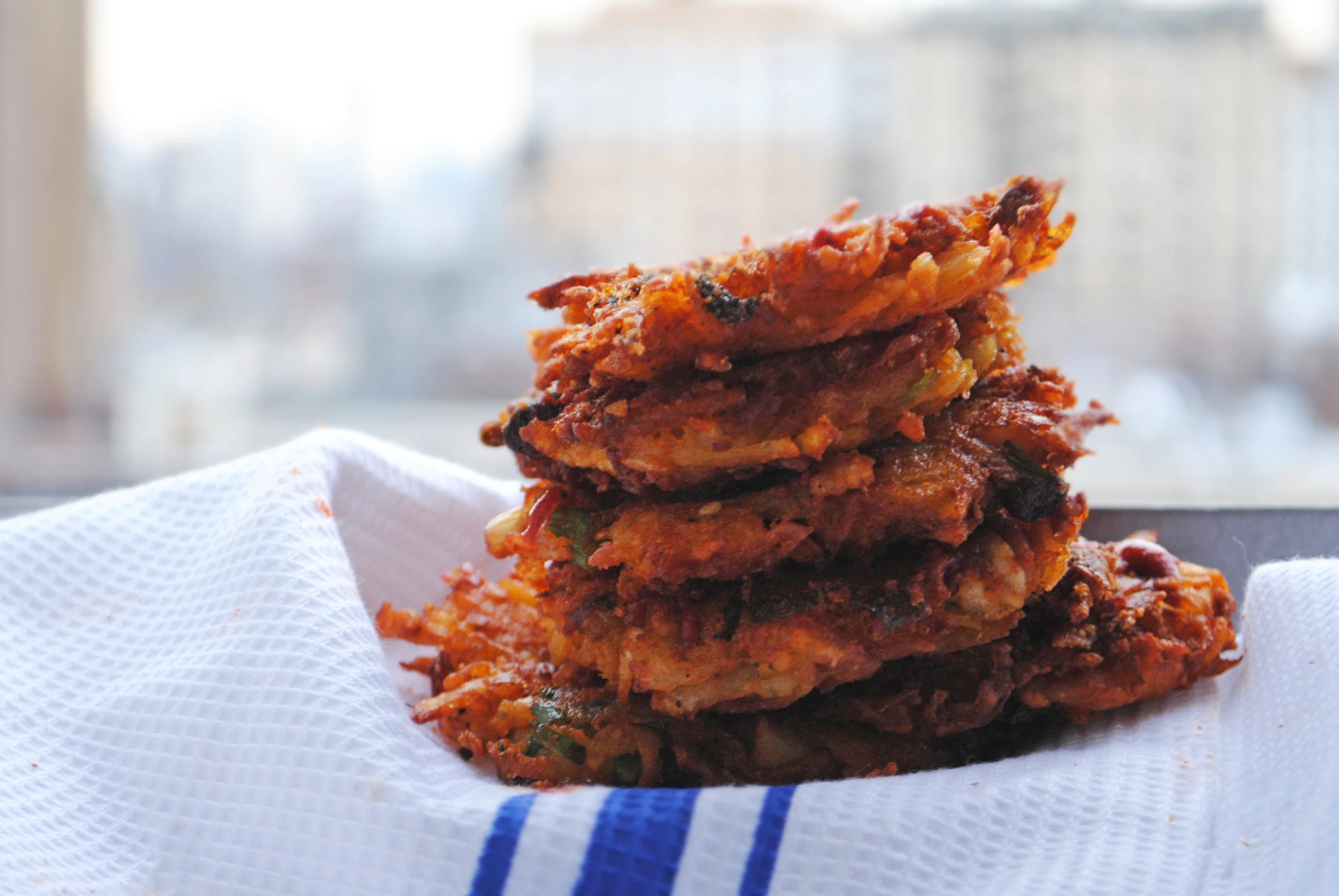CHEDDAR, SCALLION + SRIRACHA LATKES