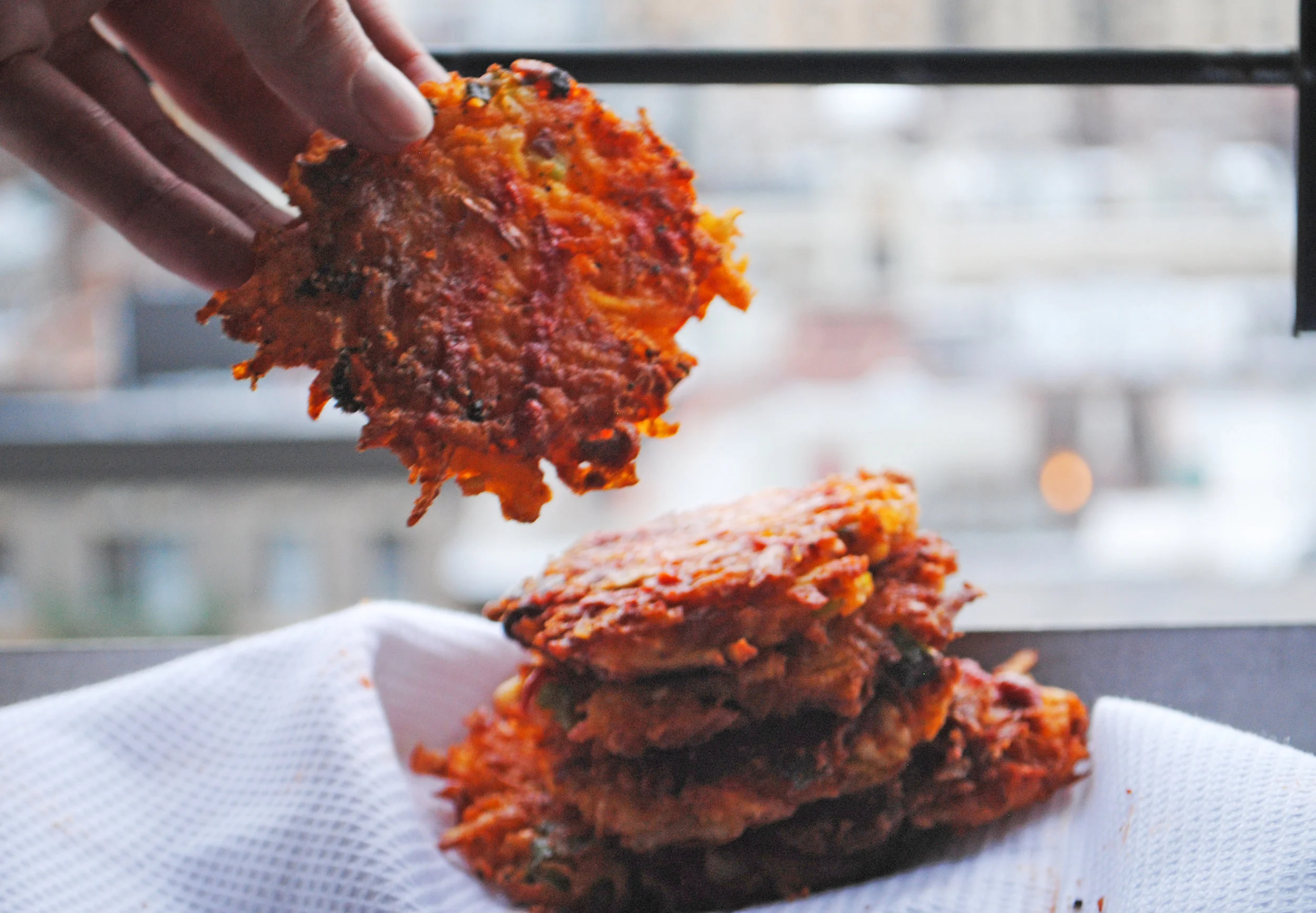 To serve: serve the latkes warm with sour cream, applesauce, or anything else you feel like dipping them into. The chipotle aioli we made yesterday would be bomb with these.