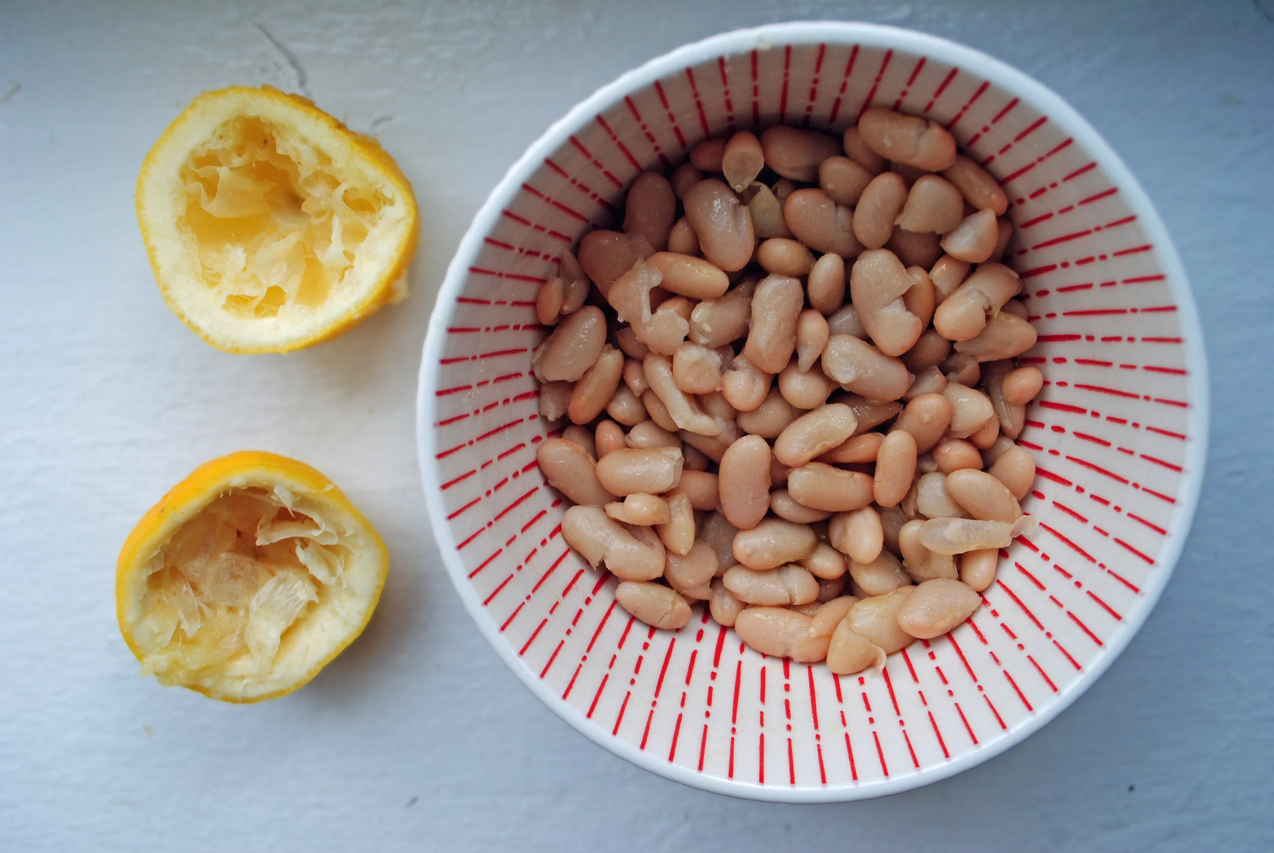 Prepare the beans: in a small bowl, combine the drained and rinsed beans, lemon juice from half a lemon, olive oil, salt and parsley. Stir and set aside.