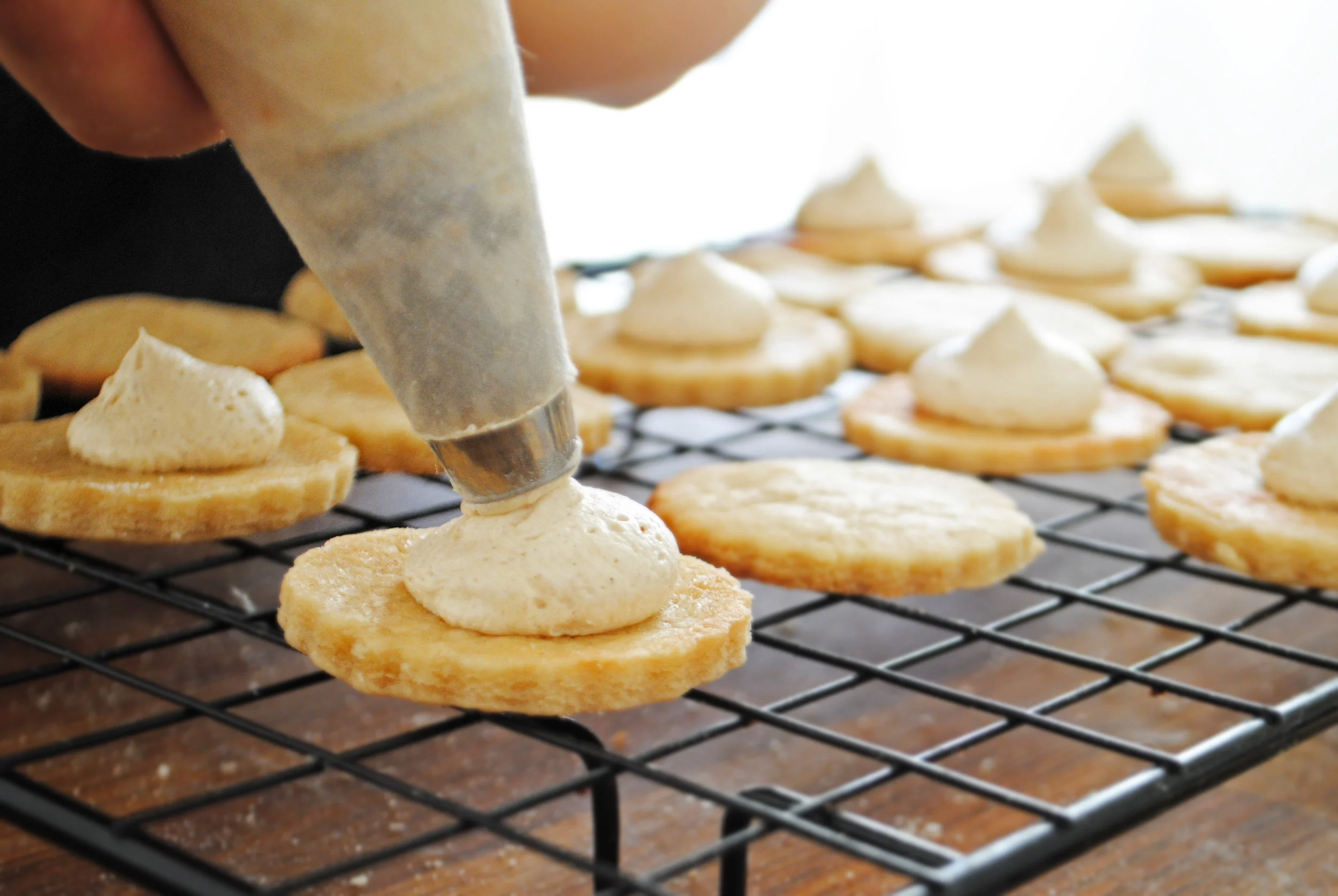 Fill the cookies: transfer filling to a piping bag or zippered bag - the best way to do this is to place the tip in the bottom of the bag so that it's poking out, and then to put the bag in a tall glass and fold the bag over the glass' edge. Fill up, then twist off the bag so that filling can't escape while you're piping. Pipe filling onto every other cookie, making sure there's enough filling to cover the cookie when pressed, but not so much that it spills out the side. Partner up the filling cookies and filling-free cookies and press lightly.