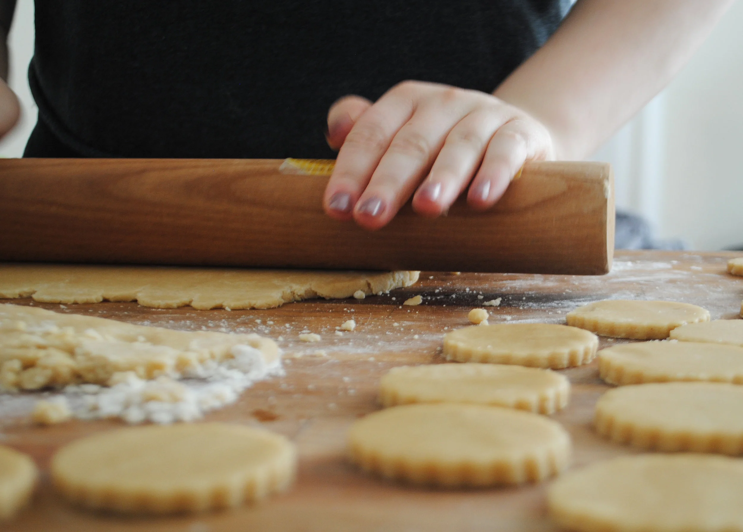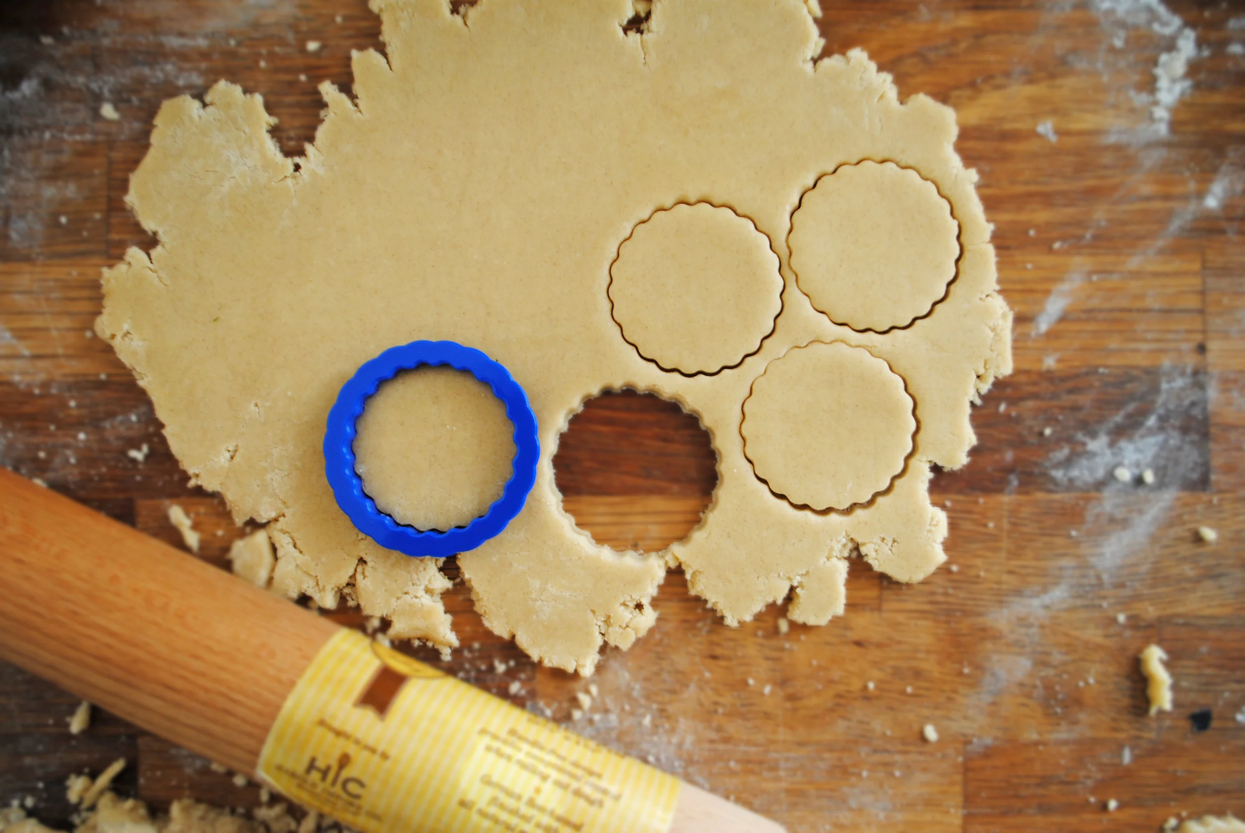 Form the cookies: preheat the oven to 350 F and line some baking sheets with parchment paper. Take the dough out of the fridge, and on a lightly floured surface roll the dough out ⅛-inch thickness. We found that the dough was way too hard to roll straight out of the fridge, so the best way to do this is to take some of the dough, warm it a bit in your hands by forming it into a cohesive ball, and then roll it out. Use your favorite cookie cutter and cut out the cookies. Place the cookies on your baking sheets and bake for 8-11 minutes, until the cookies are lightly golden around the edges. Transfer to a cooling rack to cool completely.