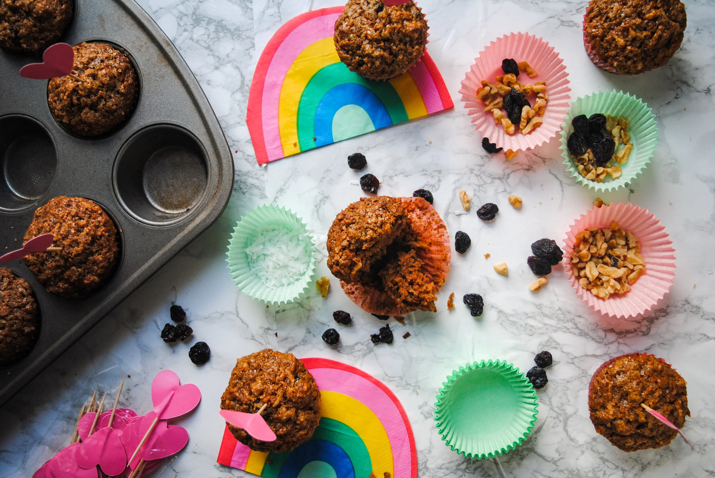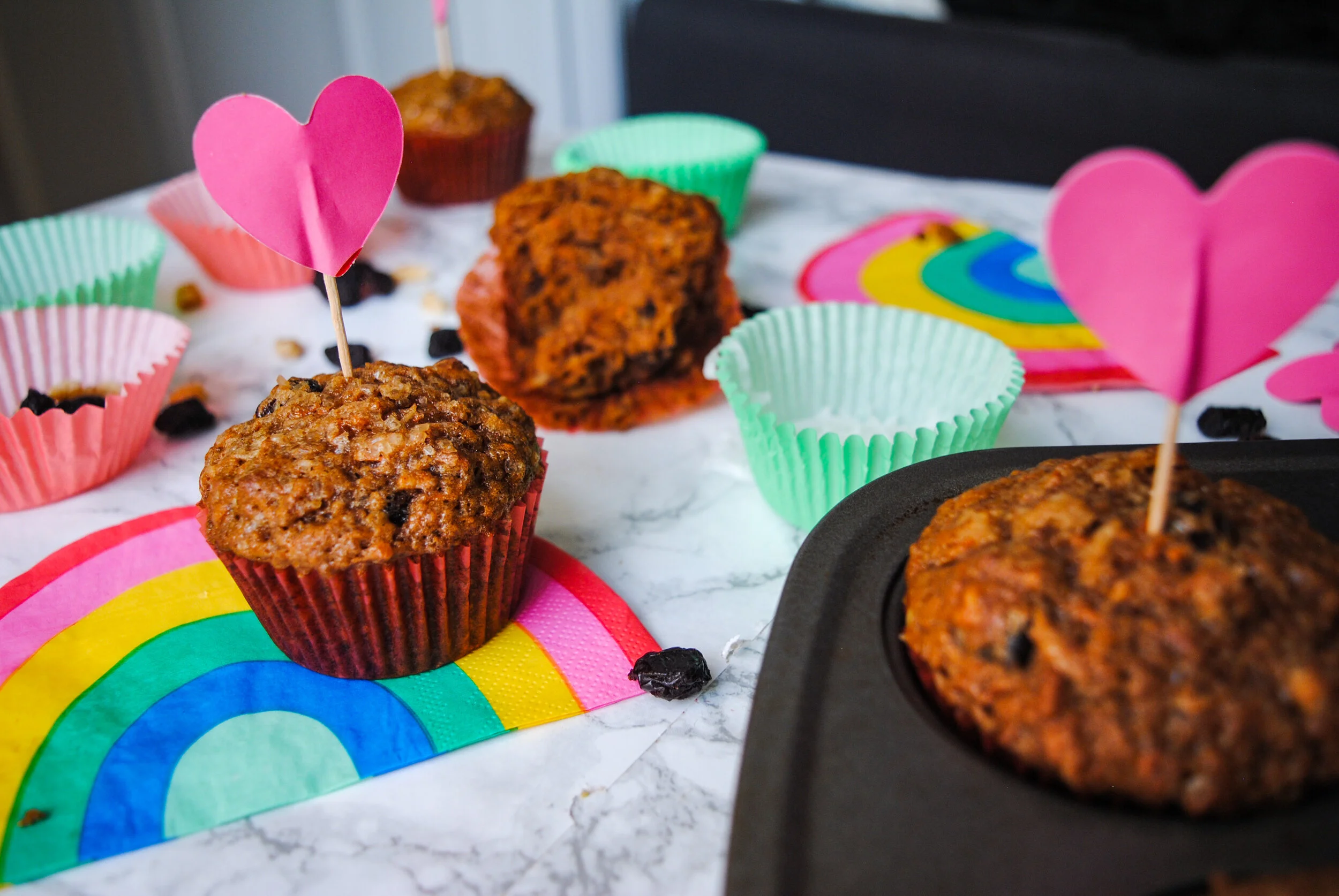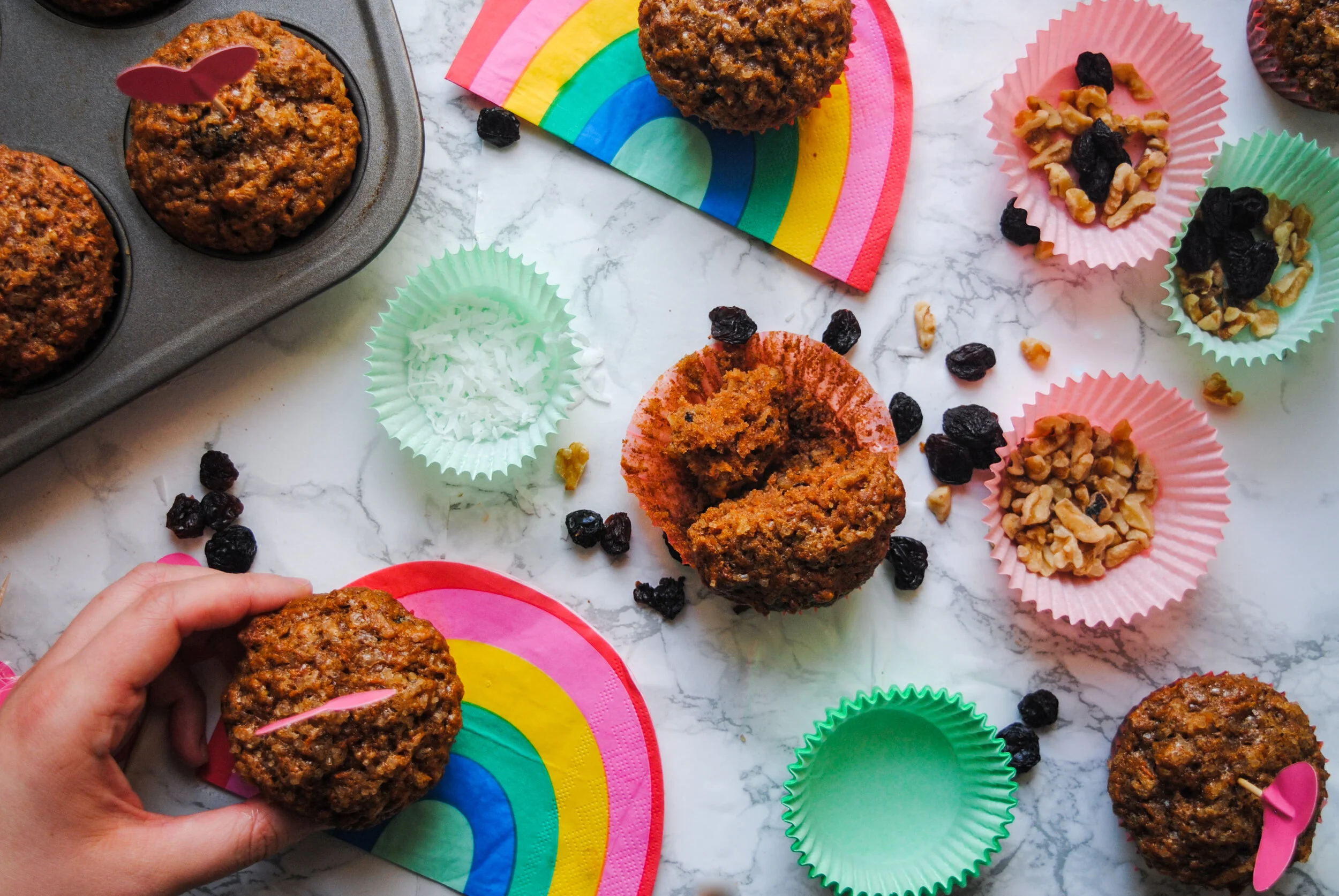 They’re v easy to customize, so you can sub in whatever fruits you like. Prepping the carrots and the fruit will take a few minutes, but after that they just hang out in the oven for 30 minutes and then you have muffins!
