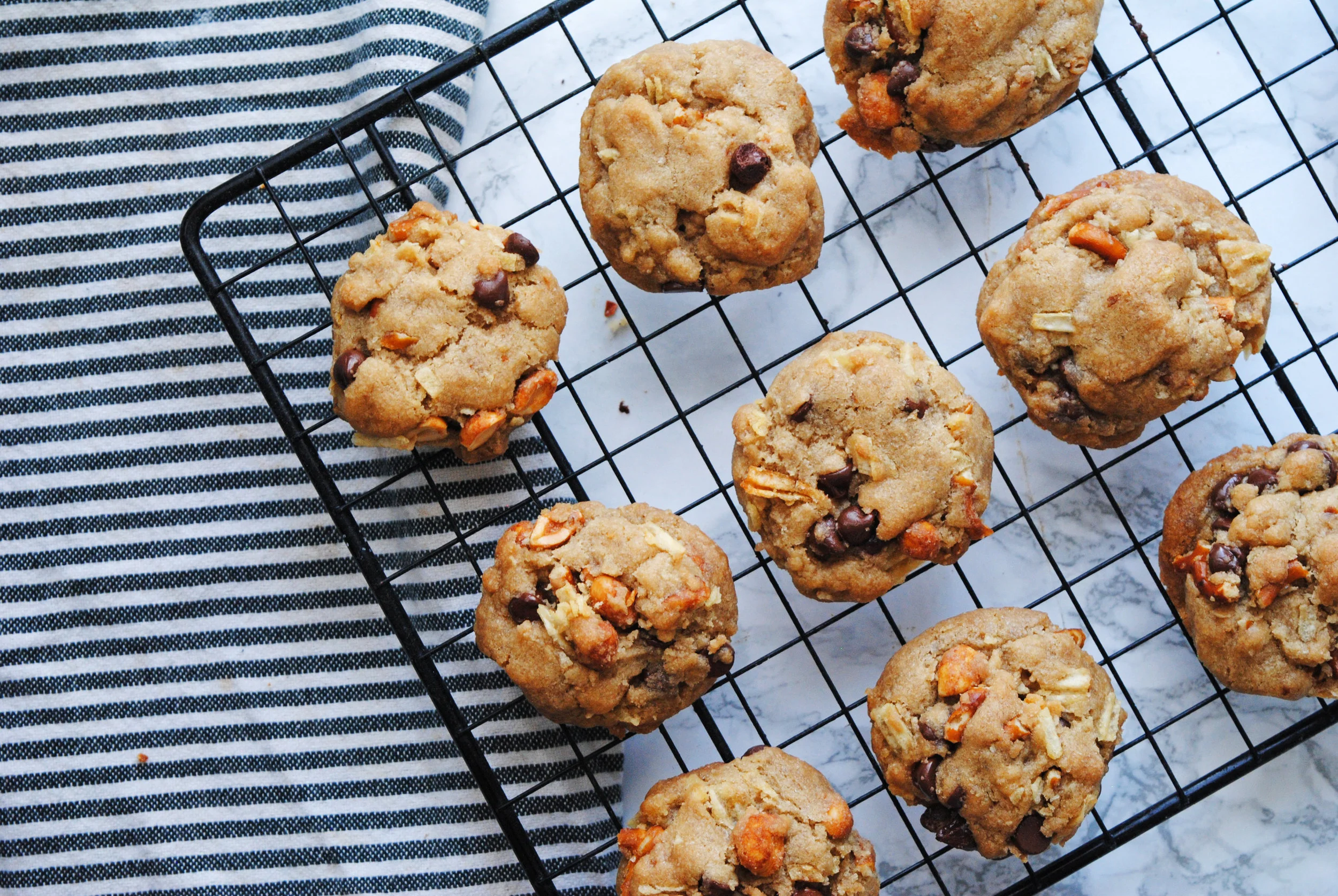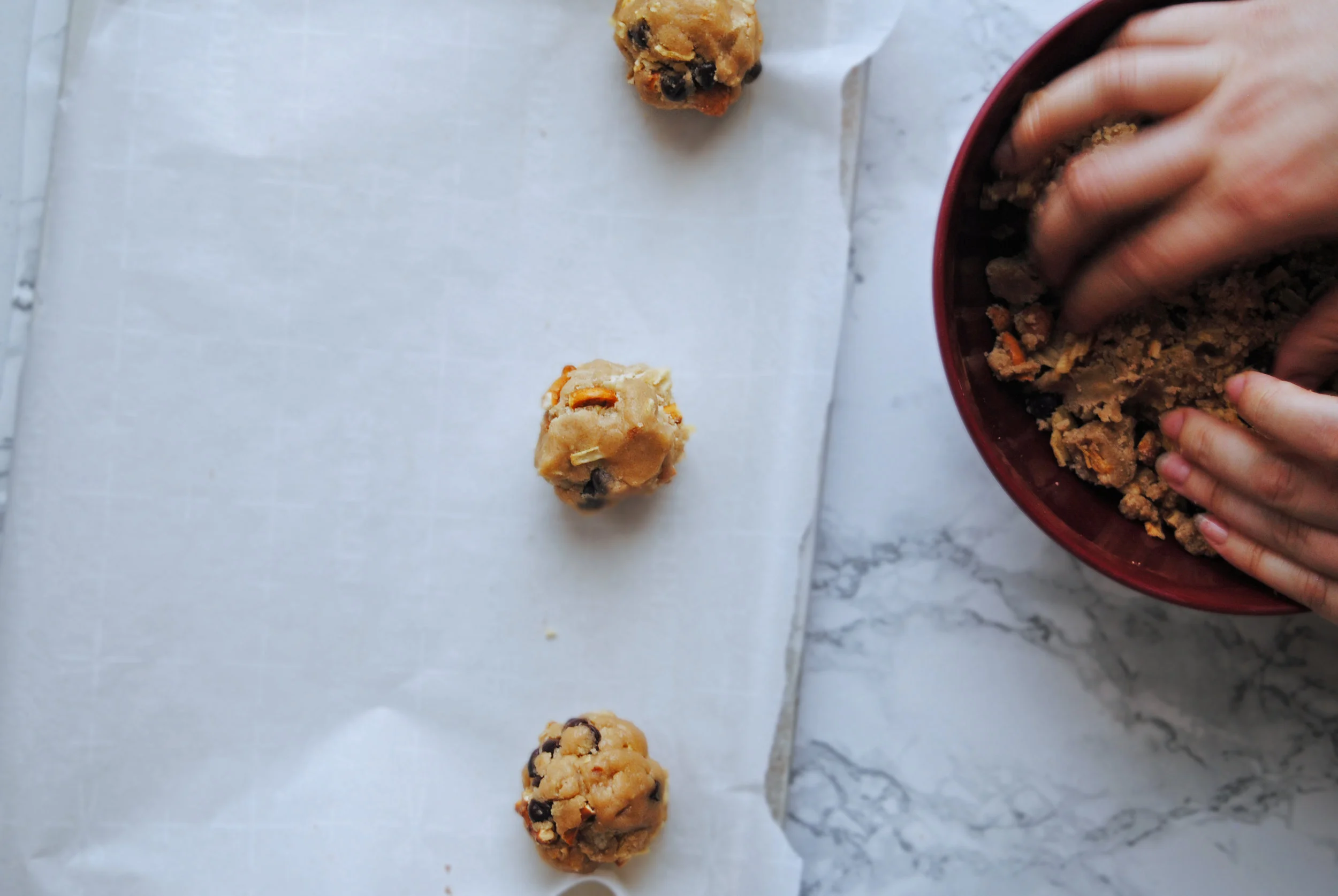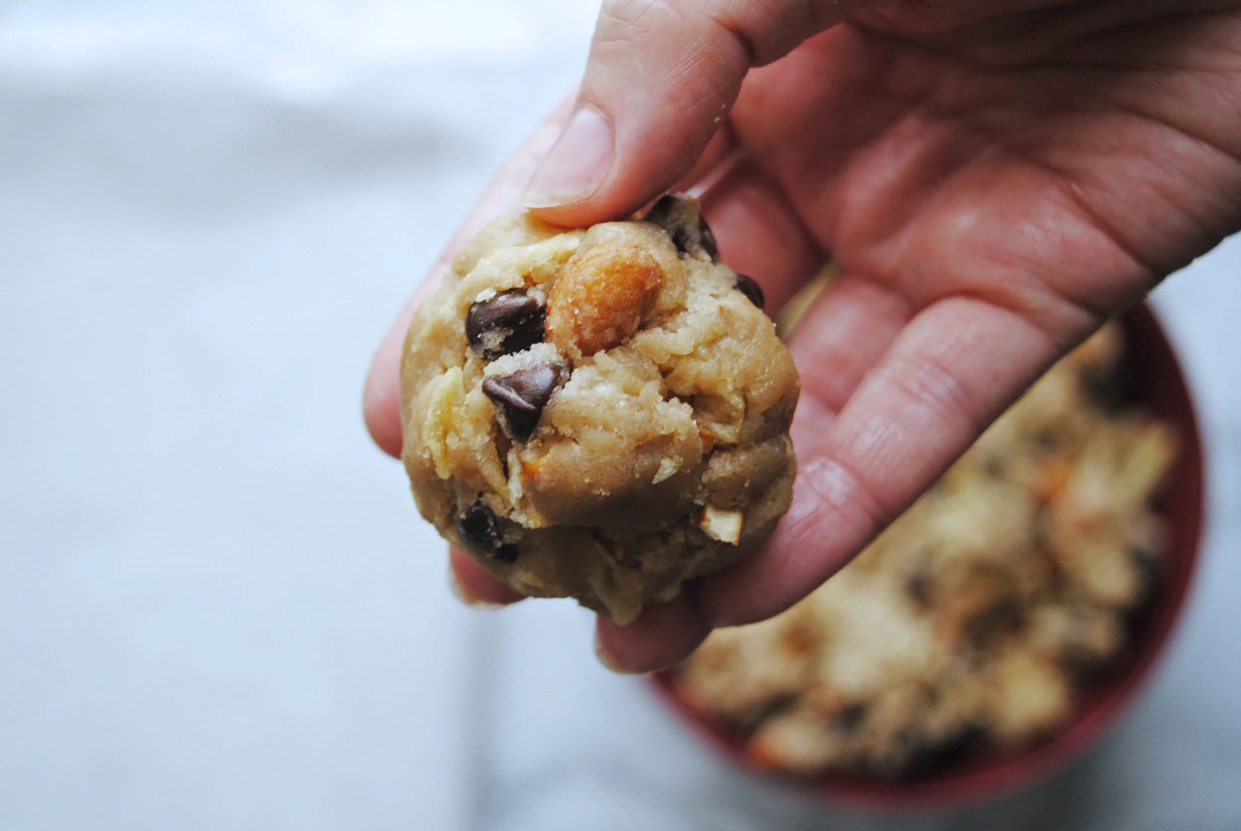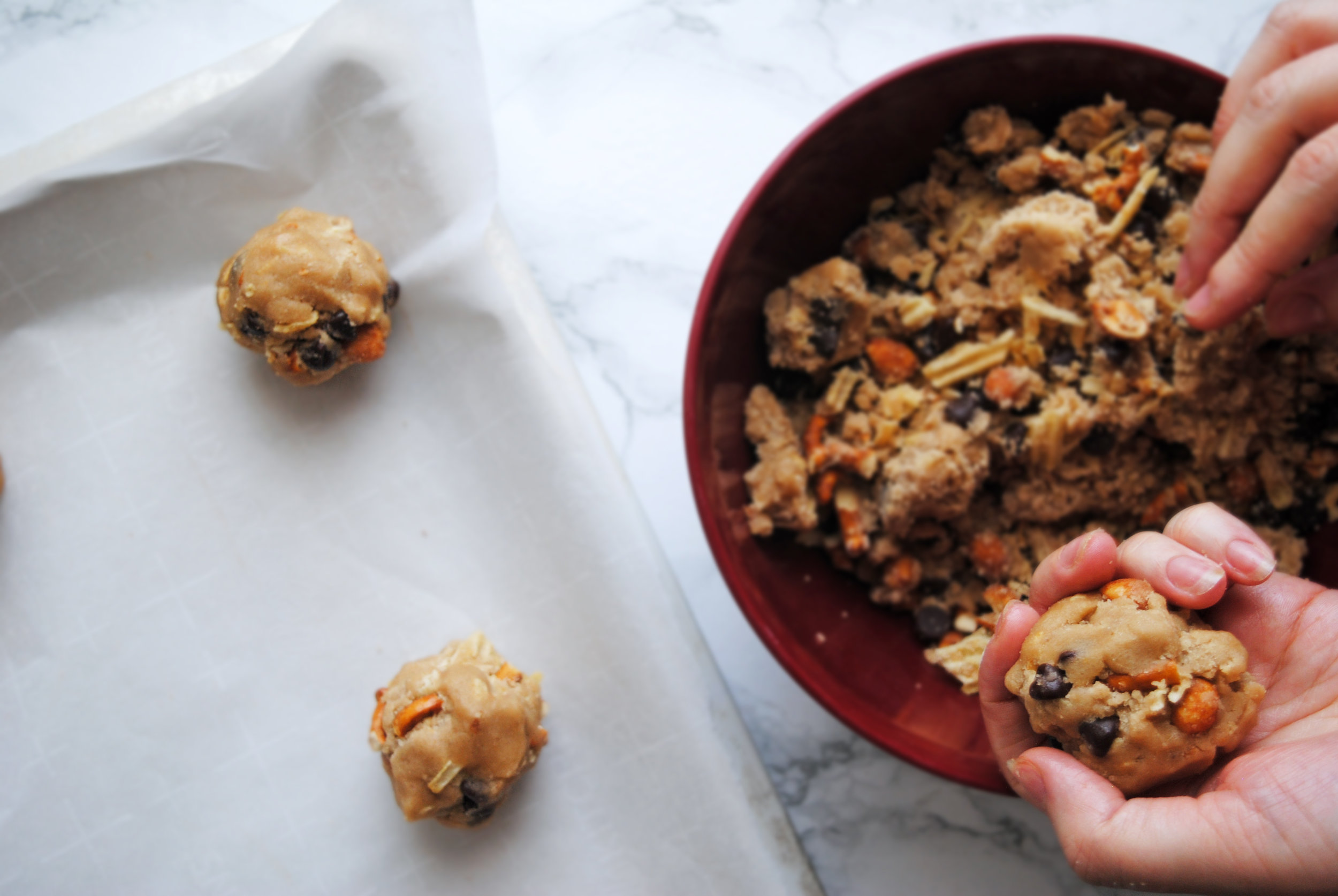 Make the dough: in a large bowl wisk together the granulated sugar, dark brown sugar, salt and melted coconut oil until combined. Add in the salt and vanilla whisk until the sugar is all dissolved and the batter is smooth. Sift in the flour and baking powder and fold it into the mix with a rubber spatula. Be careful not to overmix - it’s fine if there are a few floury bits since we’re mixing the munchies in, which should incorporate everything nicely.