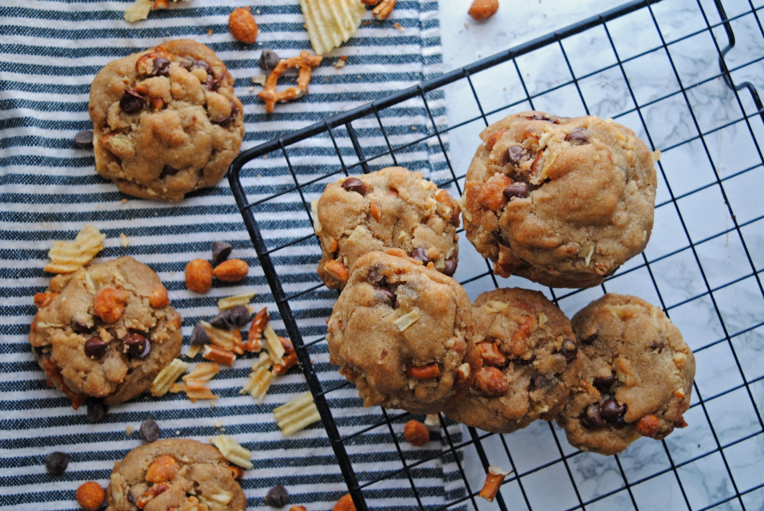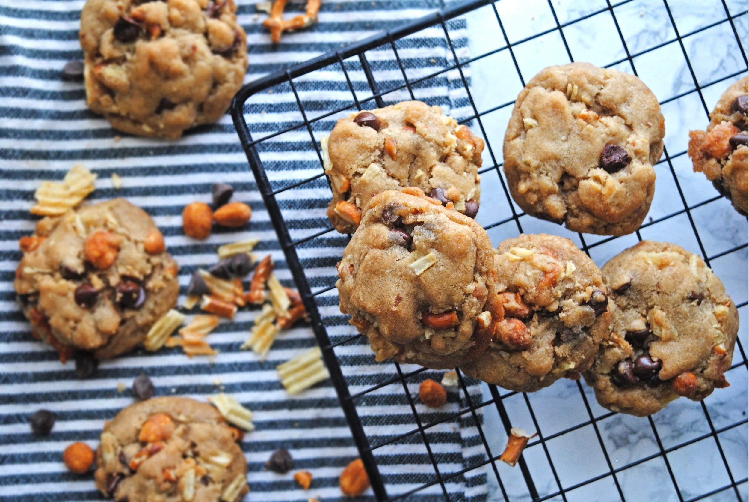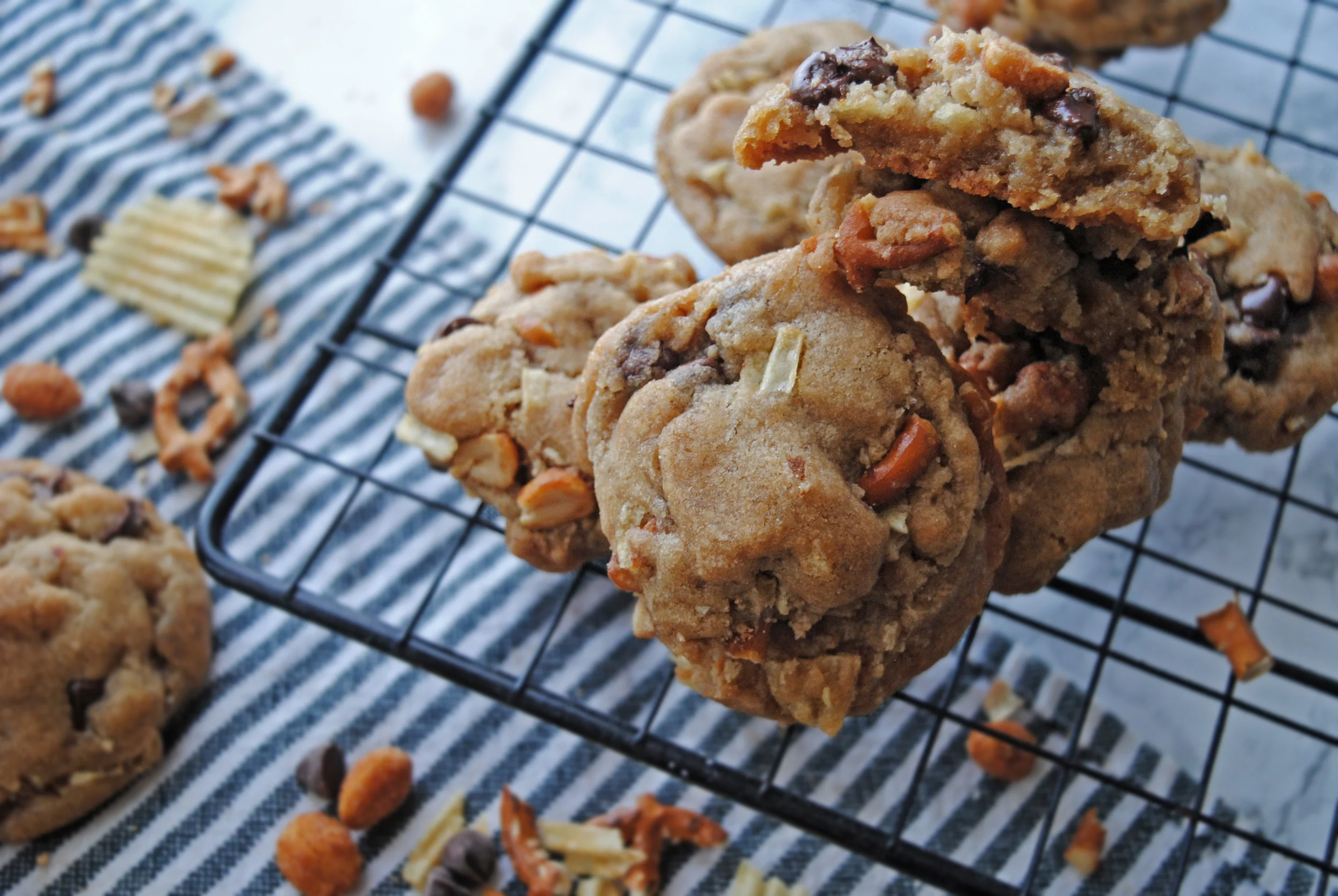 Add in the munchies: add in the chocolate chips, pretzels, potato chips and peanuts (along with anything else you might be using) and fold in until just incorporated. Pop in the fridge to chill for 30 minutes.