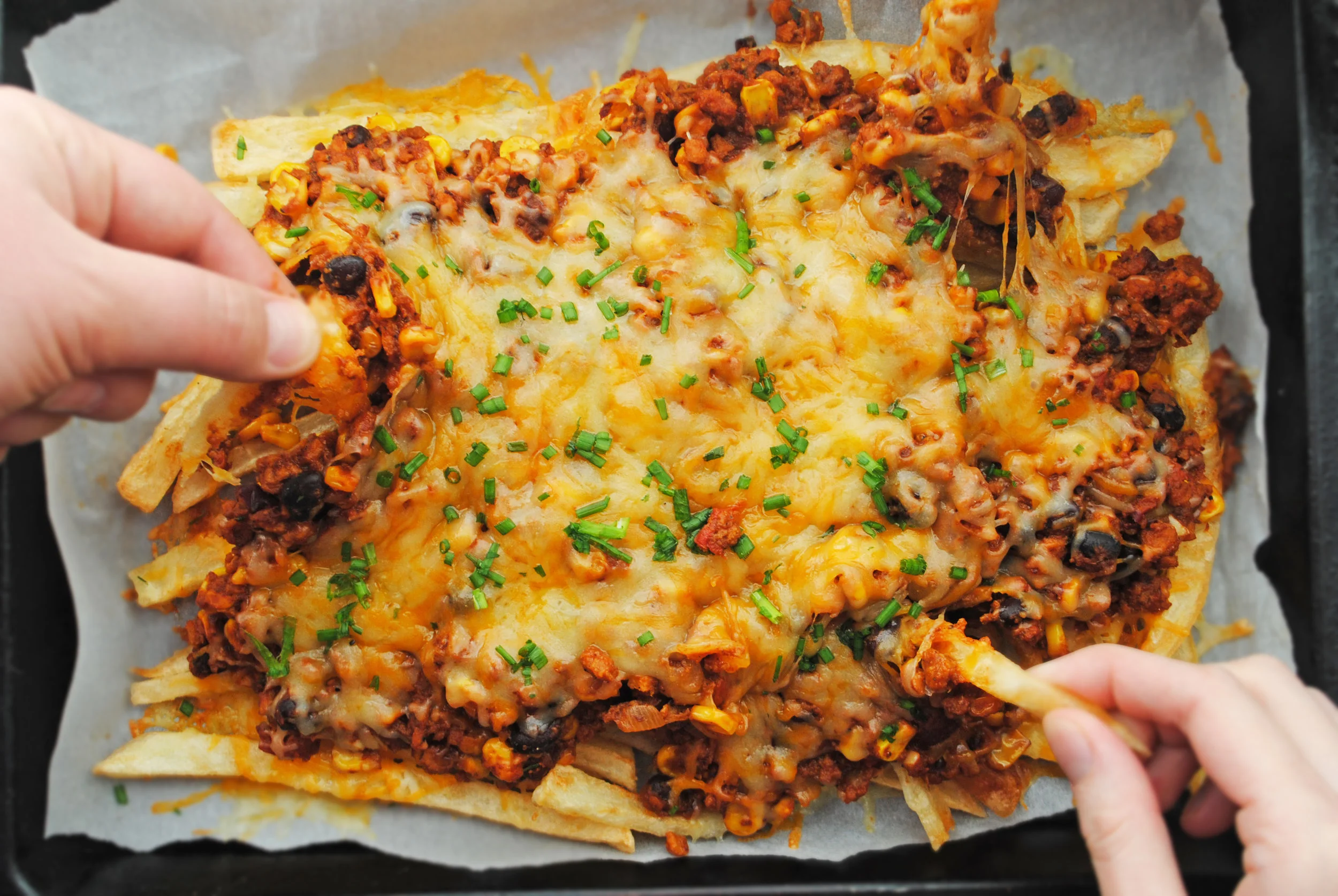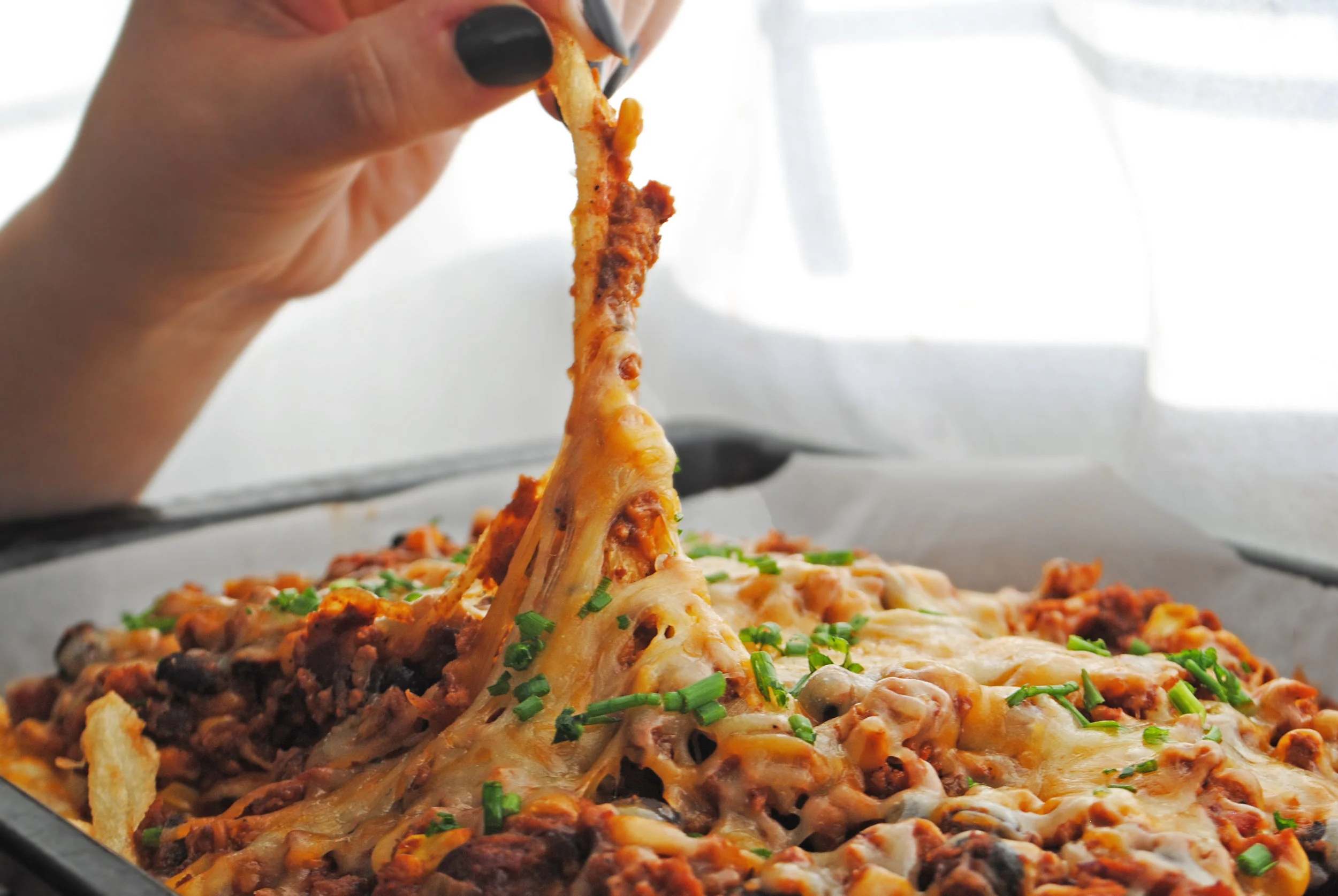 Assemble! On a large plate, tray or your kitchen table place a single layer of fries. Top with some cheese, then add the finished chili and top with more cheese. Pop in a 350 F oven for a few minutes if the cheese needs to melt some more. Dig in!